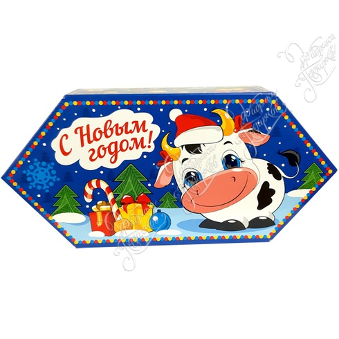 Конфетка выполнена из качественного картона, покрытого УФ-лаком, с изображением милой коровки по имени Зорька. На обратной стороне подарка детей ждет новогоднее стихотворение, которое малыш может выучить и рассказать на утреннике или на школьном празднике.
